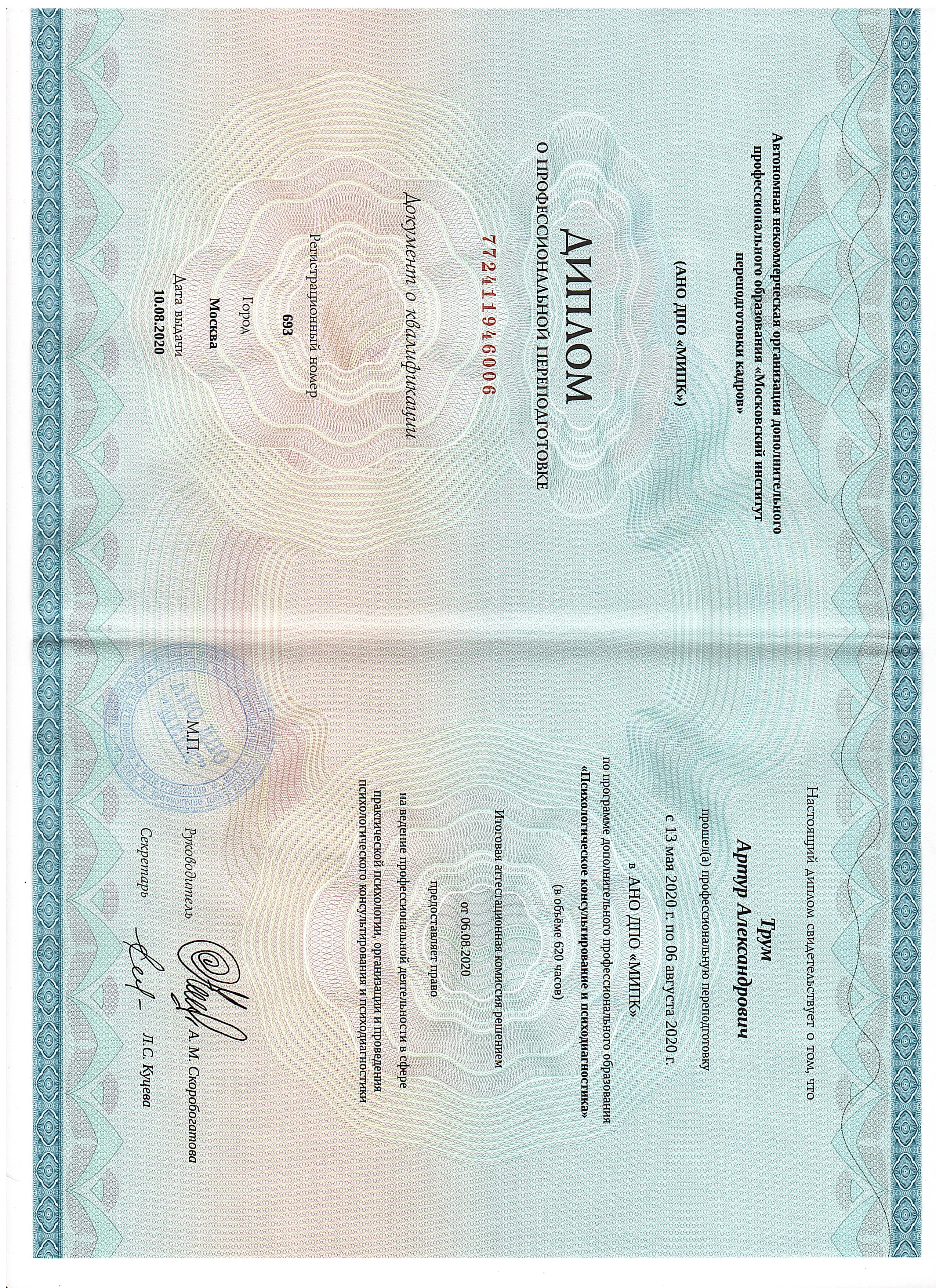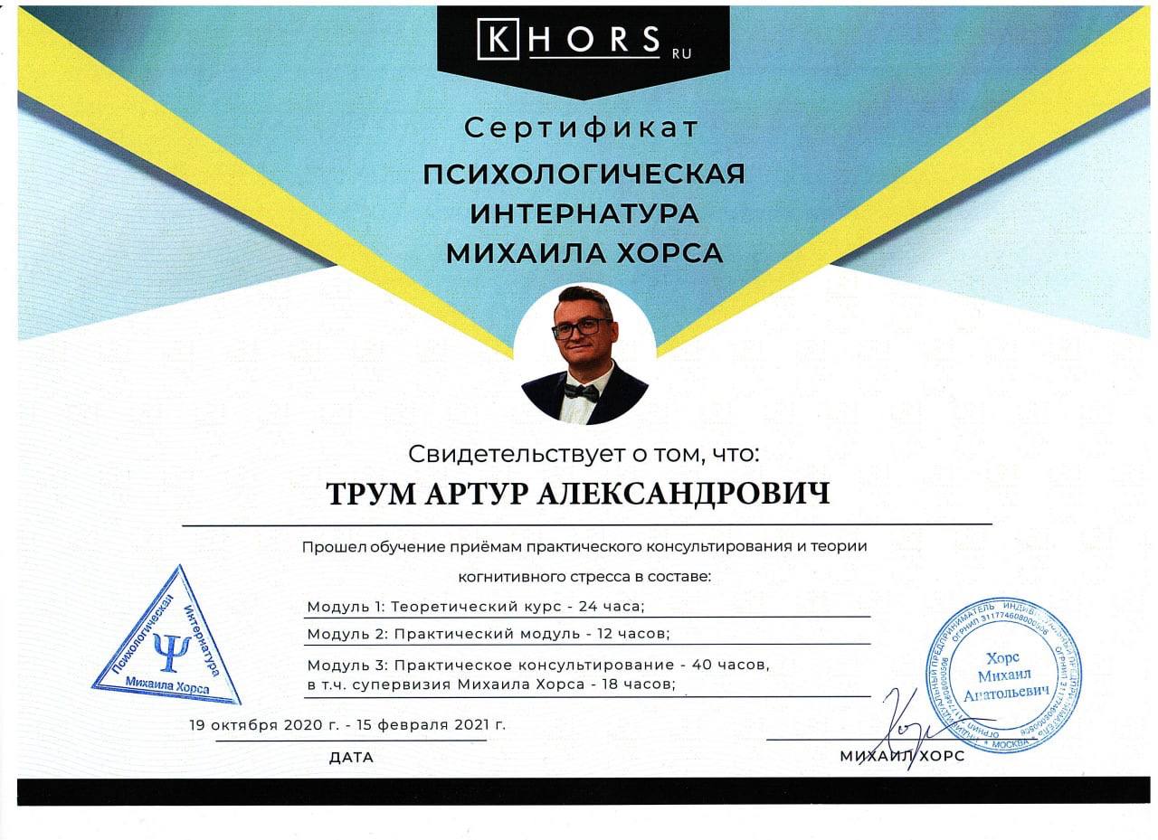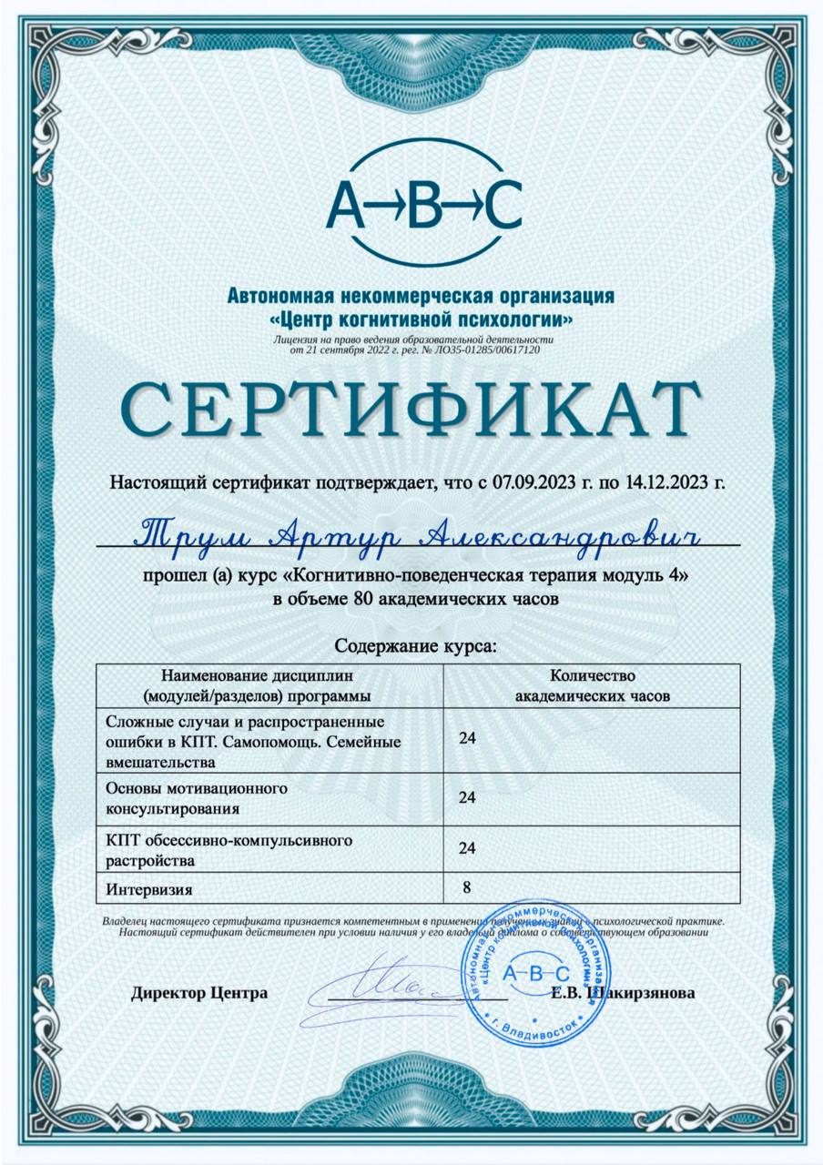 Меня зовут Трум Артур, я профессиональный психолог, магистр психологии. Чтобы доверить свои переживания специалисту, важно знать его опыт и принципы работы. Вот факты о моей квалификации: